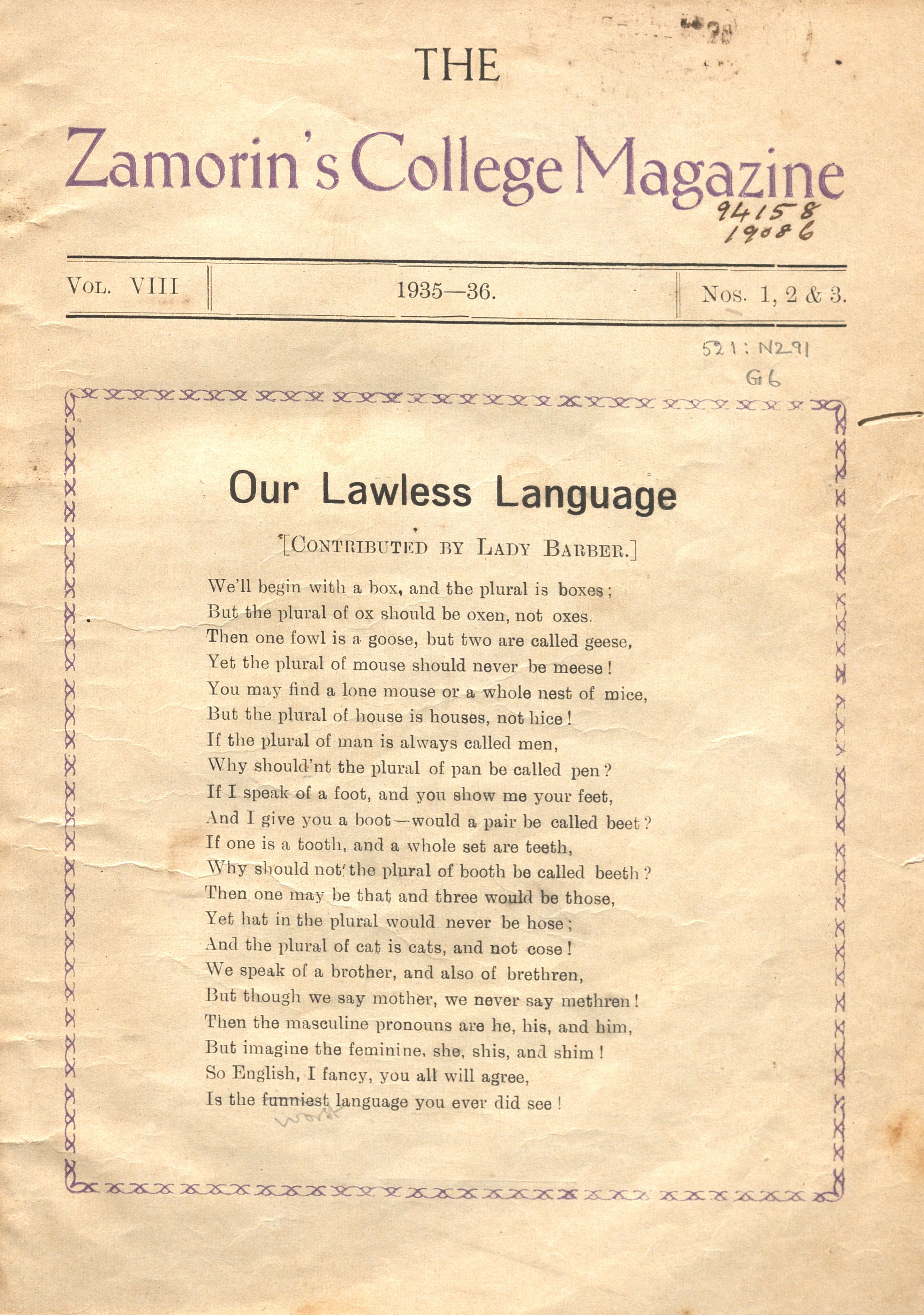 Through this post, we are releasing the digital scan of  The Zamorins College Magazine, Calicut published in the year 1935