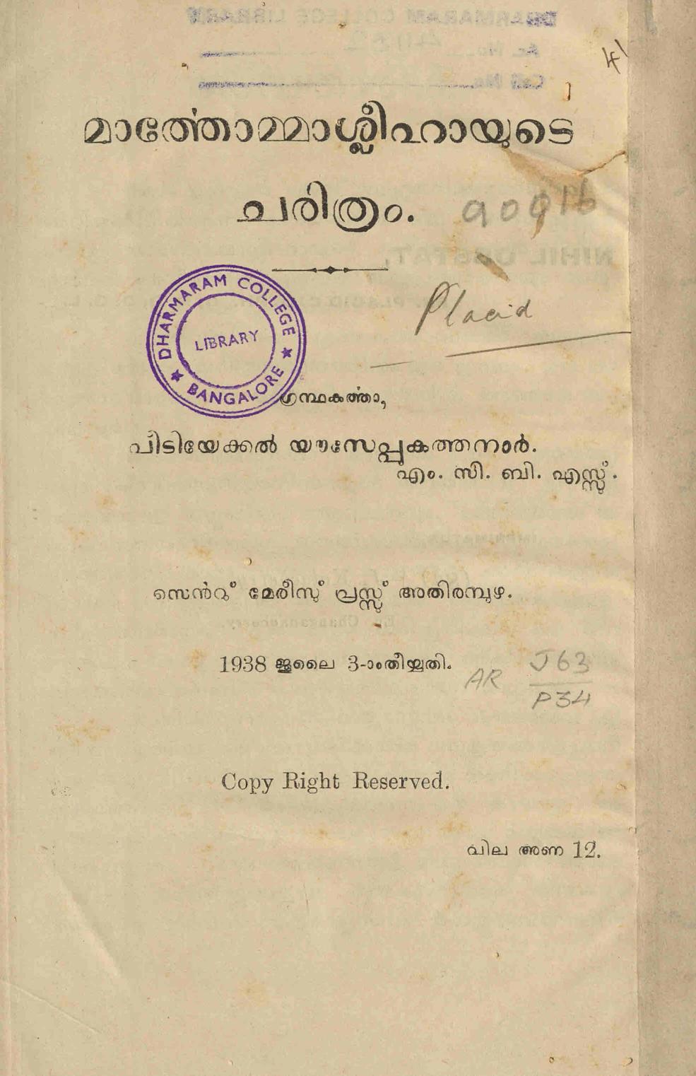 ബാംഗ്ലൂർ ധർമ്മാരാം കോളേജ് ലൈബ്രറിയിലെ ഡിജിറ്റൈസേഷൻ പദ്ധതിയിൽ നിന്നുള്ള സ്കാൻ ആണിത്.