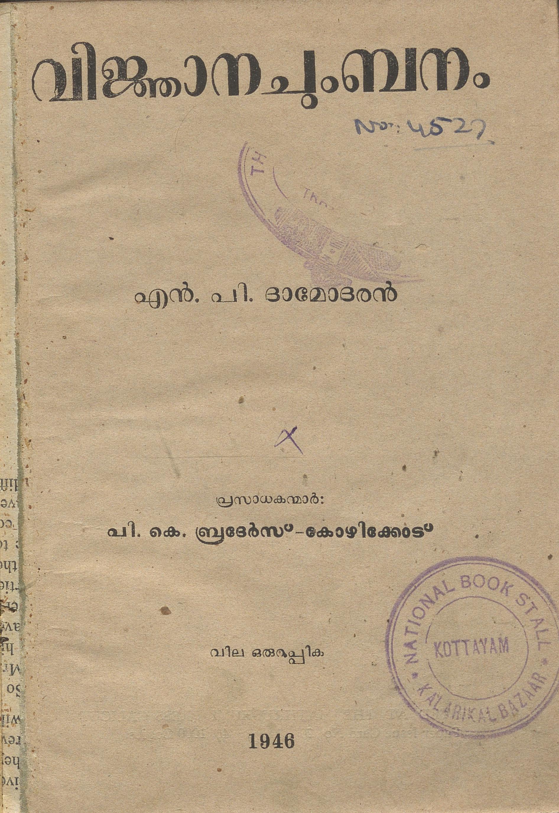1946 ൽ പ്രസിദ്ധീകരിച്ച, എൻ.പി. ദാമോദരൻ രചിച്ച വിജ്ഞാനചുംബനം എന്ന പുസ്തകത്തിൻ്റെ സ്കാൻ ആണ് ഈ പോസ്റ്റിലൂടെ പങ്കു വെക്കുന്നത്.