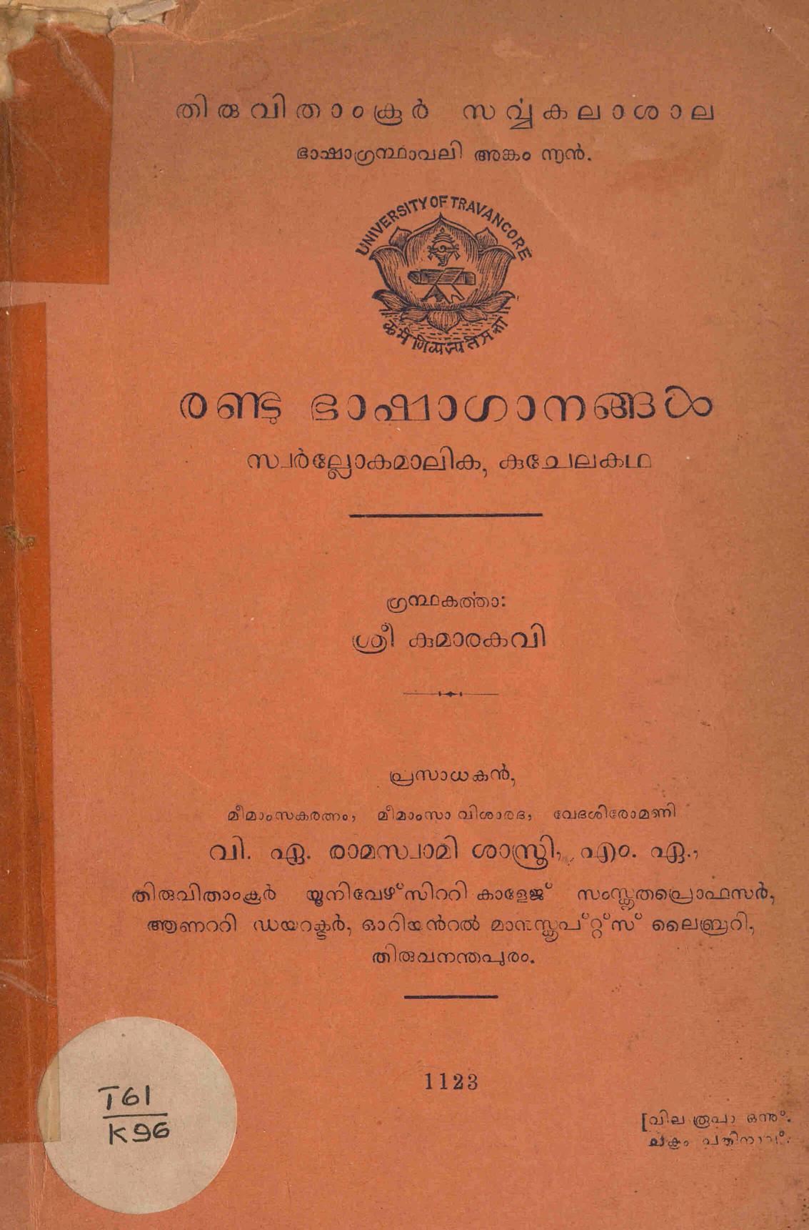 താഴെ പുസ്തകത്തിന്റെ മെറ്റാഡാറ്റയും ഡിജിറ്റൈസ് ചെയ്ത രേഖയിലേക്കുള്ള കണ്ണിയും കൊടുത്തിരിക്കുന്നു. (സ്കാൻ ഓൺലൈനായി വായിക്കാനുള്ള സൗകര്യം ഒരുക്കിയിട്ടുണ്ട്. അതേ പോലെ ആദ്യം കാണുന്ന ഇമേജിനു മുകളിൽ ക്ലിക്ക് ചെയ്താൽ ഡൗൺലോഡും ചെയ്യാം.)