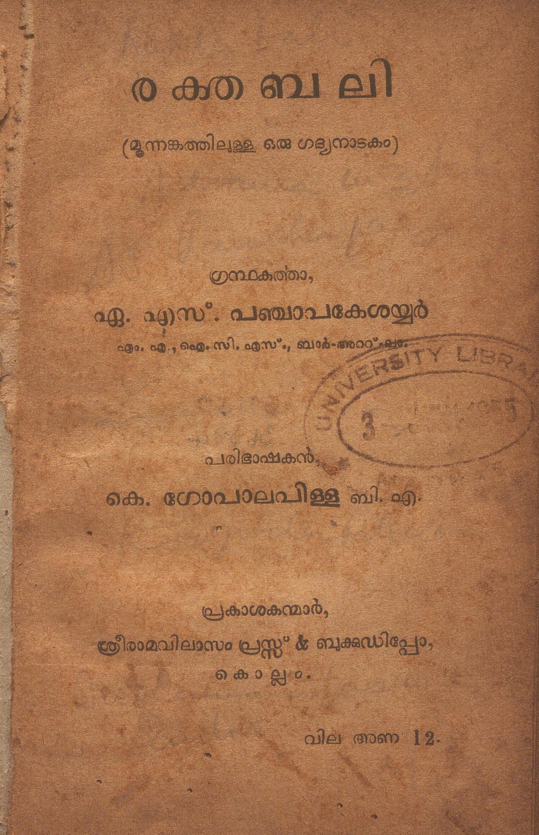 1953-ൽ പ്രസിദ്ധീകരിച്ച, എ.എസ്. പഞ്ചാപകേശയ്യർ എഴുതി കെ. ഗോപാലപിള്ള വിവർത്തനം ചെയ്ത രക്തബലി എന്ന പുസ്തകത്തിൻ്റെ ഡിജിറ്റൽ സ്കാൻ ആണ് ഈ പോസ്റ്റിലൂടെ പങ്കു വെക്കുന്നത്