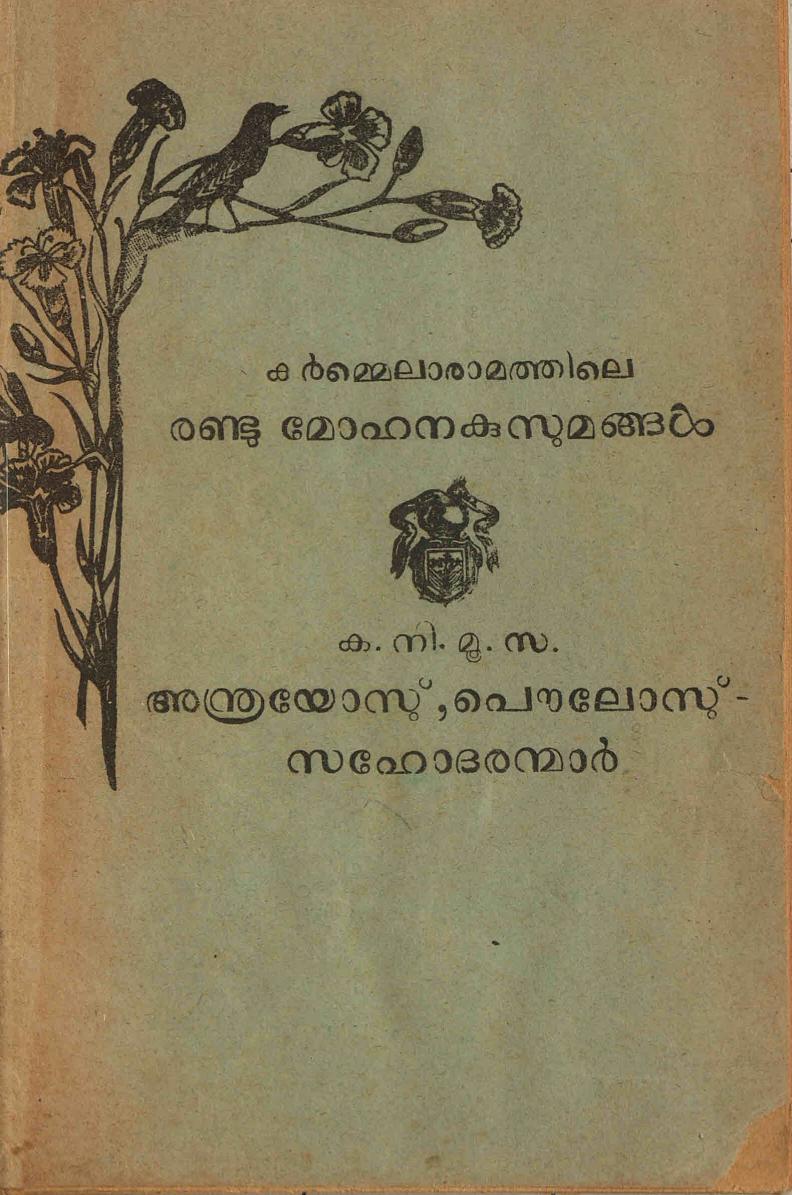 1956 ൽ ക.നി.മു.സ പ്രസിദ്ധീകരിച്ച അമ്പഴക്കാട്ട് കർമ്മെല ആശ്രമത്തിൽ സേവനമനുഷ്ടിച്ച അന്ത്രയോസ്, പൗലോസ് എന്നീ സഹോദരന്മാരുടെ ജീവചരിത്രമായ കർമ്മെലാരാമത്തിലെ രണ്ടു മോഹന കുസുമങ്ങൾ എന്ന കൃതിയുടെ സ്കാൻ ആണ് ഈ പോസ്റ്റിലൂടെ പങ്കു വെക്കുന്നത്.
