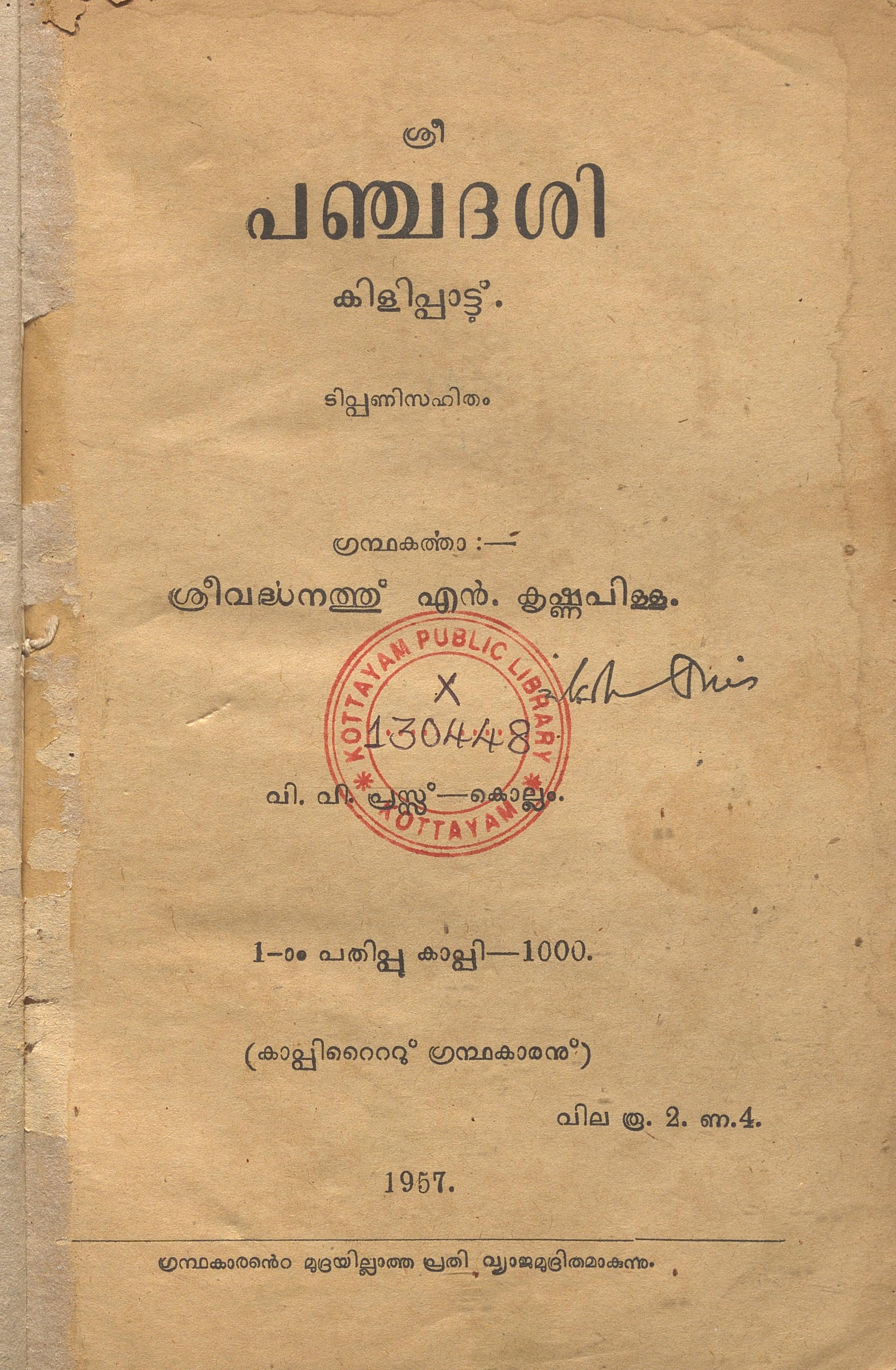1957-ൽ പ്രസിദ്ധീകരിച്ച, ശ്രീവർദ്ധനത്തു് എൻ. കൃഷ്ണപിള്ള  എഴുതിയ ശ്രീ പഞ്ചദശി കിളിപ്പാട്ട് എന്ന കൃതിയുടെ ഡിജിറ്റൽ സ്കാൻ ആണ് ഈ പോസ്റ്റിലൂടെ പങ്കു വെക്കുന്നത്.