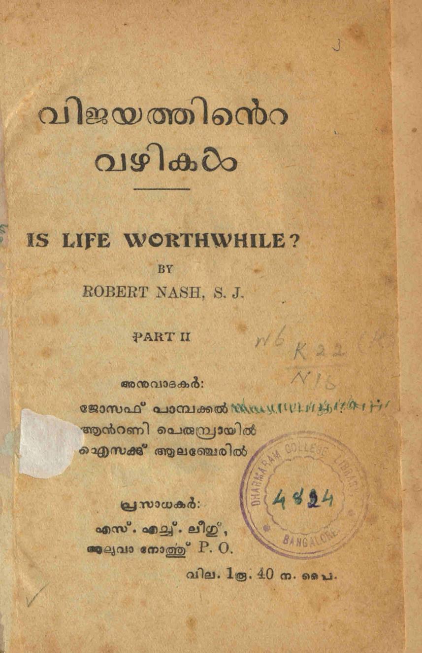 1958 ൽ പ്രസിദ്ധീകരിച്ച റോബർട്ട് നാഷ് എസ്.ജെ. രചിച്ച Is Life Worthwhile എന്ന പുസ്തകപരമ്പരയുടെ മലയാള പരിഭാഷയായ വിജയത്തിൻ്റെ വഴികൾ രണ്ടാം ഭാഗത്തിൻ്റെ സ്കാനാണ് ഈ പോസ്റ്റിലൂടെ പങ്കുവെക്കുന്നത്. മറ്റു ഭാഗങ്ങൾ ലഭ്യമായിട്ടില്ല. മലയാള പരിഭാഷ നിർവ്വഹിച്ചിട്ടുള്ളത് ജോസഫ് പാമ്പക്കൽ, ആൻ്റണി പെരുമ്പ്രായിൽ, ഐസക്ക് ആലഞ്ചേരിൽ എന്നിവർ ചേർന്നാണ്.