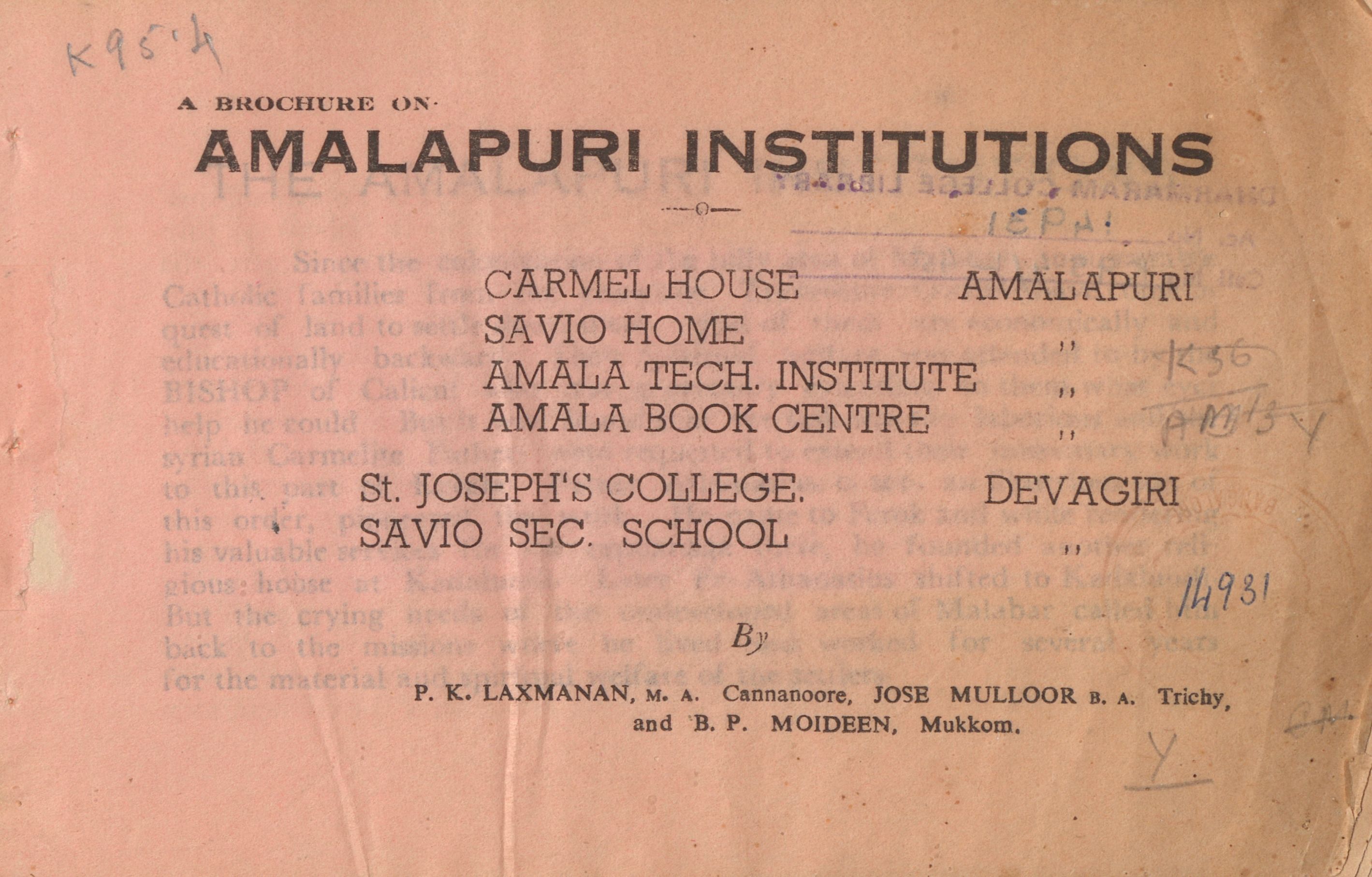 This brochure is a souvenir of the Amalapuri Institutions depicting the pictures of the institution buildings with the narration of the work put in by the leaders like Fr. Hormice, Rev. Shabore, Rev. Maurus, Rev. Daniel and other leaders of the Carmalita Congregation. The institutions like Carmel House, Savio Home, Amala Tech Institute, Amala Book Centre at Amalapuri and St. Joseph’s College and Savio Sec. School in Devagiri.