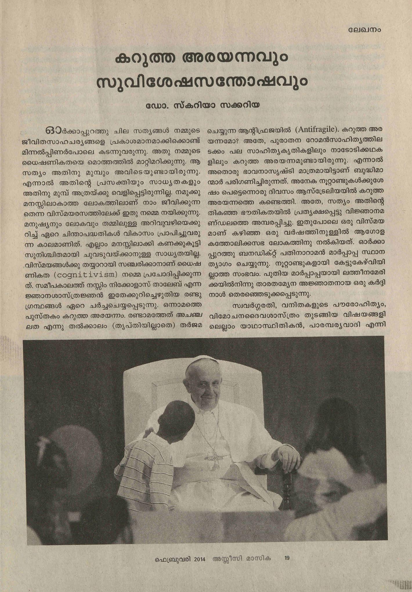 2014 ഫെബ്രുവരി മാസത്തിൽ ഇറങ്ങിയ അസ്സീസ്സി കുടുംബ മാസികയിൽ സ്കറിയ സക്കറിയ എഴുതിയ കറുത്ത അരയന്നവും സുവിശേഷസന്തോഷവും എന്ന ലേഖനത്തിൻ്റെ സ്കാനാണ് ഈ പോസ്റ്റിലൂടെ പങ്കു വെക്കുന്നത്.