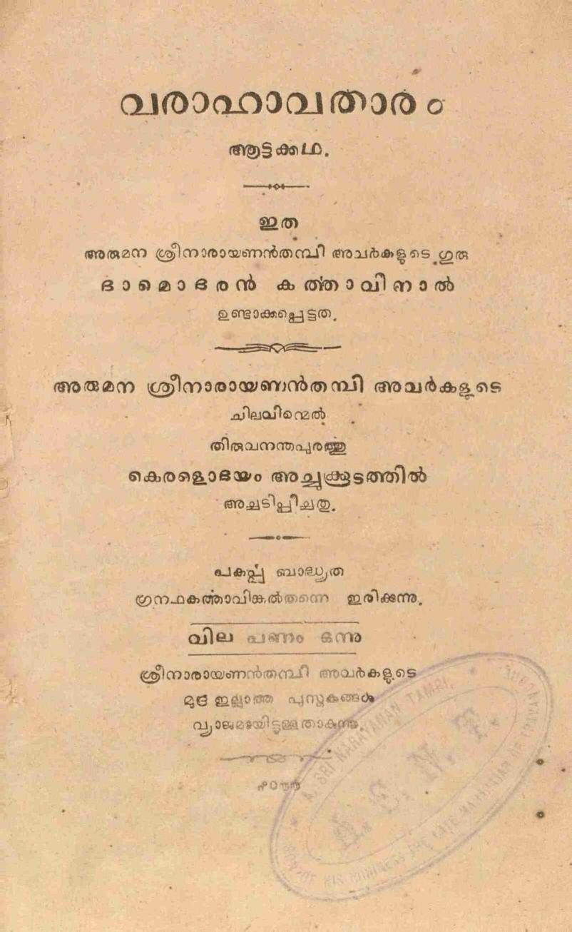 താഴെ പുസ്തകത്തിൻ്റെ മെറ്റാഡാറ്റയും ഡിജിറ്റൈസ് ചെയ്ത രേഖയിലേക്കുള്ള കണ്ണിയും കൊടുത്തിരിക്കുന്നു. (സ്കാനിൽ ഓൺലൈനായി വായിക്കാനുള്ള സൗകര്യം ഒരുക്കിയിട്ടുണ്ട്. അതേ പോലെ ആദ്യം കാണുന്ന ഇമേജിനു മുകളിൽ ക്ലിക്ക് ചെയ്താൽ ഡൗൺലോഡും ചെയ്യാം