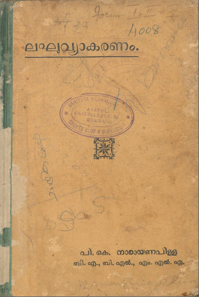 1936 – ൽ പ്രസിദ്ധീകരിച്ച, പി കെ നാരായണപിള്ള എഴുതിയ ലഘുവ്യാകരണം എന്ന പുസ്തകത്തിൻ്റെ സ്കാൻ ആണ് ഈ പോസ്റ്റിലൂടെ പങ്കുവെക്കുന്നത്.