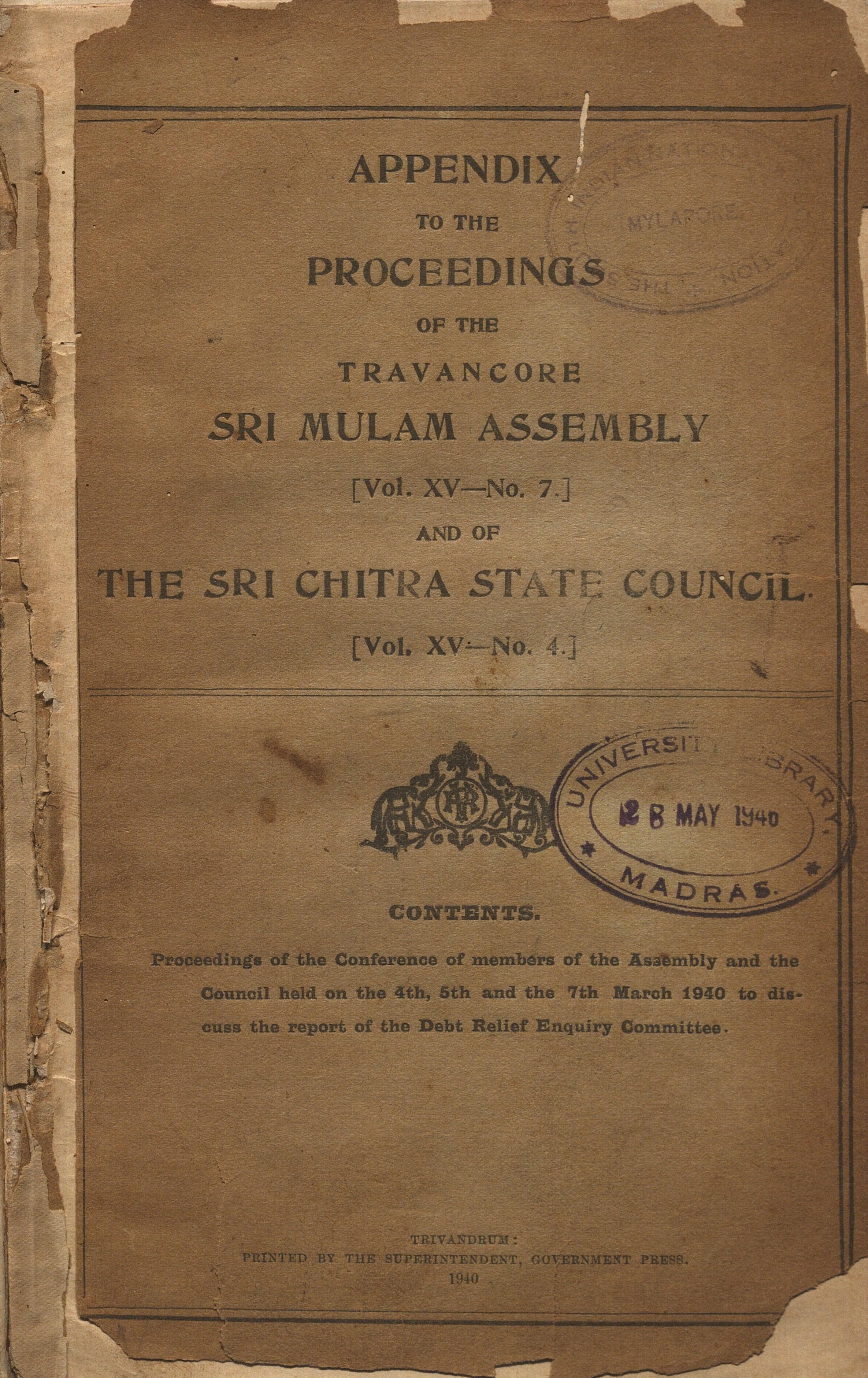 vol. XV-no. 7 and of the Travancore Sri Chitra State Council vol. XV- no. 4 - പ്രസിദ്ധീകരണ വർഷം: 1940