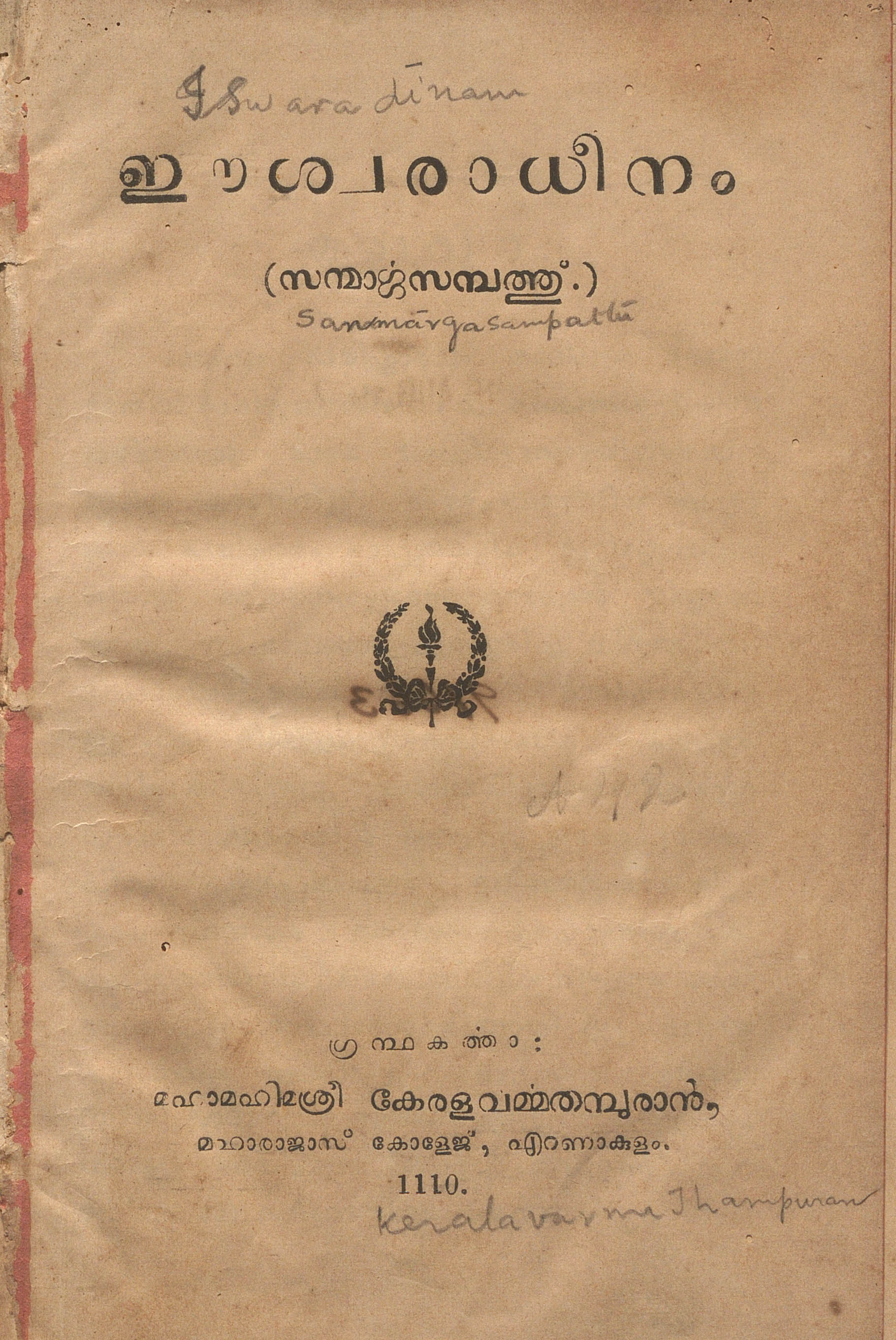 1935 ൽ കേരളവർമ്മ വലിയകോയി തമ്പുരാൻ രചിച്ച ഈശ്വരാധീനം എന്ന ഗദ്യനാടകത്തിൻ്റെ ഡിജിറ്റൽ സ്കാൻ ആണ് ഈ പോസ്റ്റിലൂടെ പങ്കു വയ്ക്കുന്നത്.