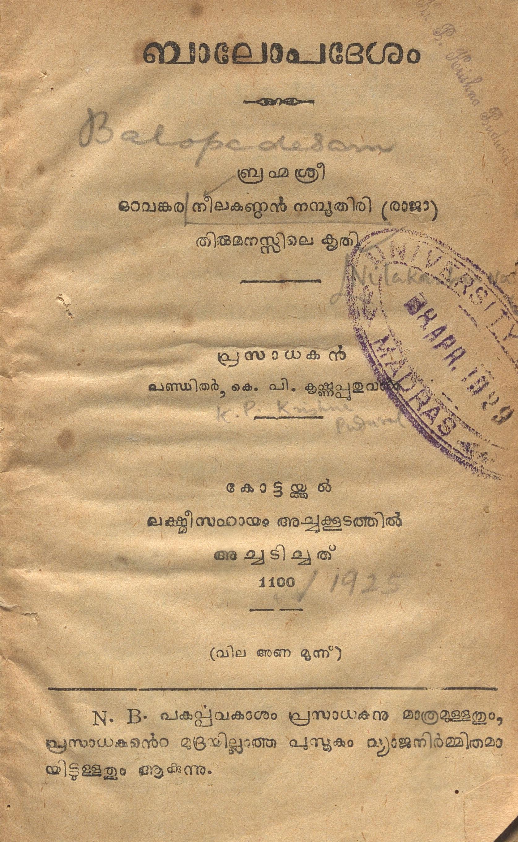 1925-ൽ പ്രസിദ്ധീകരിച്ച, ഒറവങ്കര നീലകണ്ഠൻ നമ്പൂതിരി എഴുതിയ ബാലോപദേശം എന്ന പുസ്തകത്തിൻ്റെ ഡിജിറ്റൽ സ്കാൻ ആണ് ഈ പോസ്റ്റിലൂടെ പങ്കു വെക്കുന്നത്1925 – ബാലോപദേശം