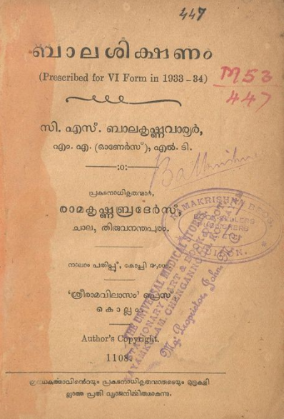 1933-ൽ സി.എസ്. ബാലകൃഷ്ണവാര്യർ രചിച്ച ബാലശിക്ഷണം എന്ന പുസ്തകത്തിൻ്റെ സ്കാൻ ആണ് ഈ പോസ്റ്റിലൂടെ പങ്കുവെക്കുന്നത്.