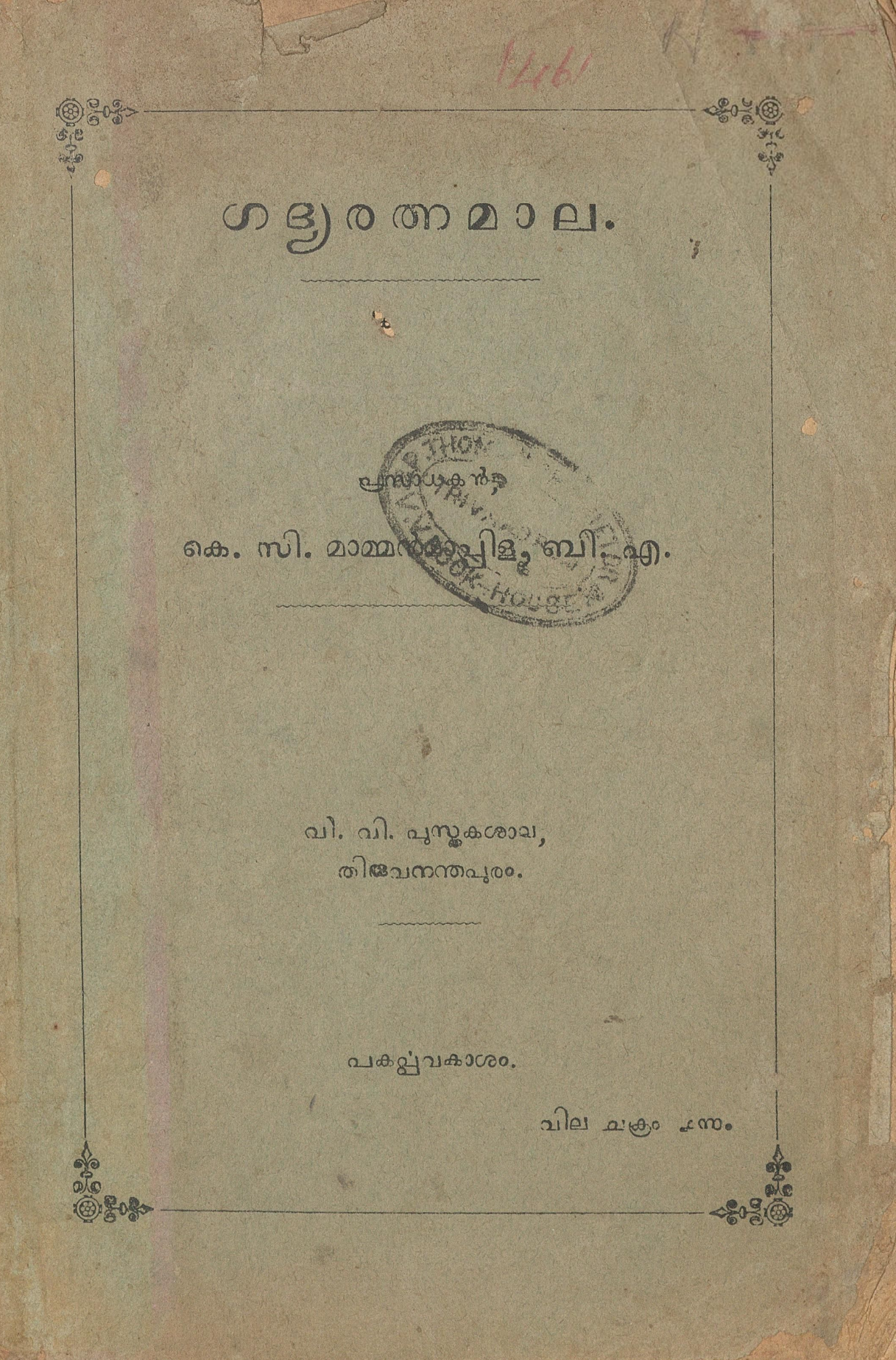 താഴെ പുസ്തകത്തിന്റെ മെറ്റാഡാറ്റയും ഡിജിറ്റൈസ് ചെയ്ത രേഖയിലേക്കുള്ള കണ്ണിയും കൊടുത്തിരിക്കുന്നു. (സ്കാൻ ഓൺലൈനായി വായിക്കാനുള്ള സൗകര്യം ഒരുക്കിയിട്ടുണ്ട്.)