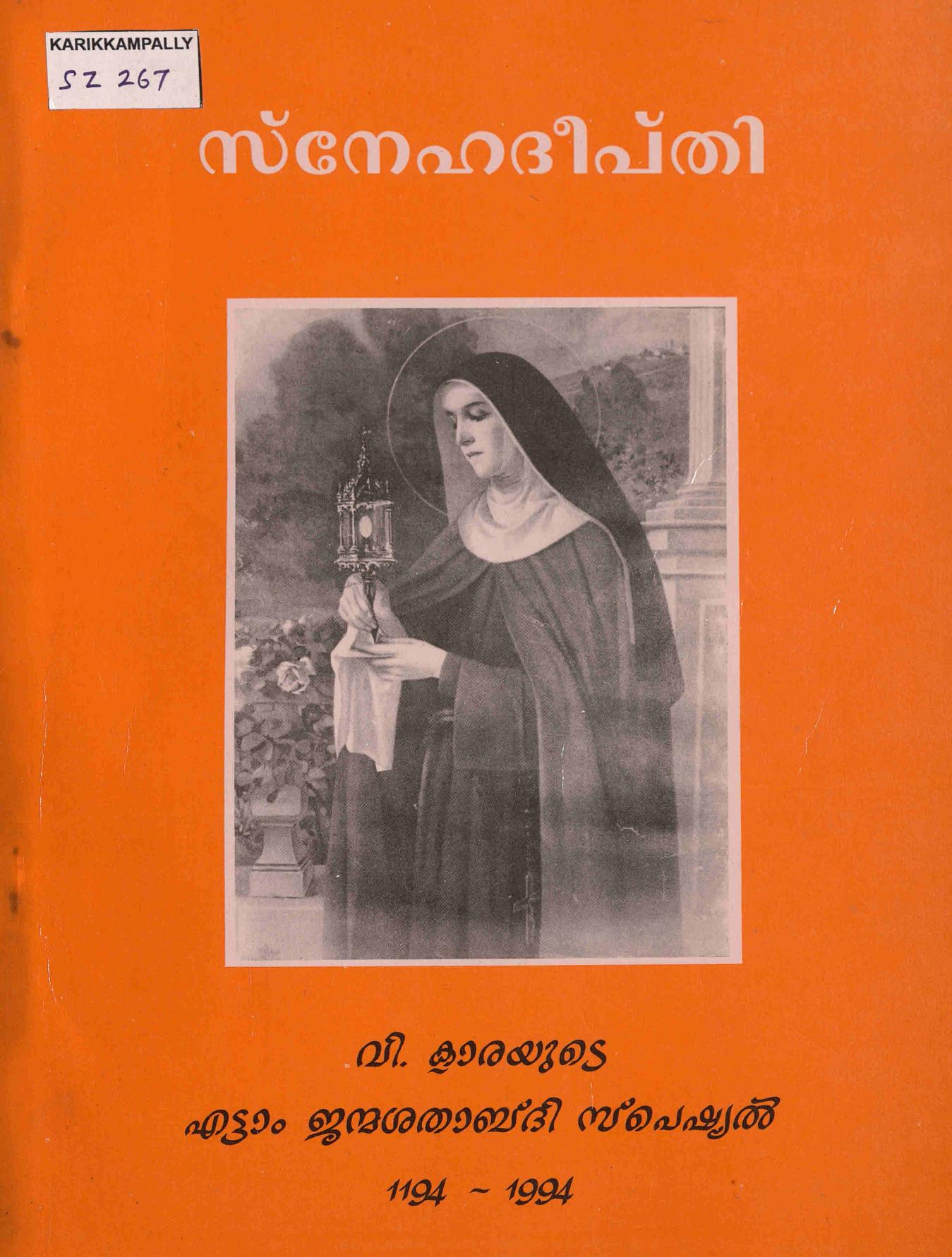 അസ്സീസിയിലെ ക്ലാര എന്ന പേരിൽ അറിയപ്പെടുന്ന വിശുദ്ധ ക്ലാരയുടെ എട്ടാം ജന്മശതാബ്ദിയോട് അനുബന്ധിച്ച് ആലുവയിലെ Franciscan Clarist Congregation പ്രസിദ്ധീകരിച്ച സ്നേഹദീപ്തി അഥവാ  വിശുദ്ധ ക്ലാരയുടെ എട്ടാം ജന്മശതാബ്ദി സ്പെഷ്യൽ എന്ന സ്മരണികയുടെ ഡിജിറ്റൽ സ്കാൻ ആണ് പോസ്റ്റിലൂടെ പങ്കു വെക്കുന്നത്.