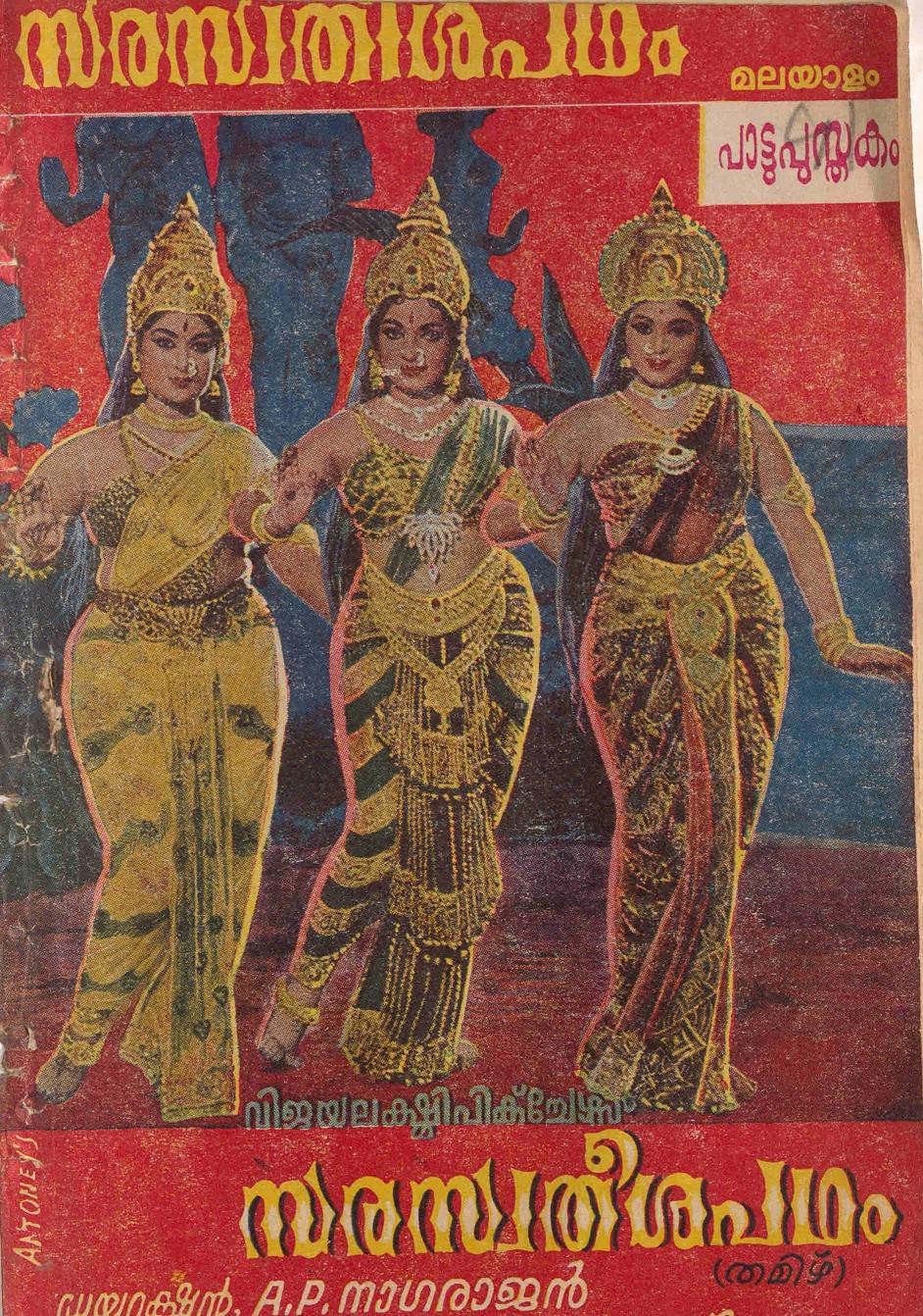 1966ൽ A.P. നാഗരാജൻ്റെ സംവിധാനത്തിൽ പുറത്തിറങ്ങിയ സ്വരസ്വതീശപഥം എന്ന തമിഴ് സിനിമ റിലീസ് ചെയ്തതിനു ഒപ്പം കേരളത്തിൽ പ്രസ്തുത സിനിമയിലെ തമിഴ് പാട്ടുകൾ മലയാളലിപിയിൽ ആക്കിയതും ഒപ്പം സിനിമയുടെ കഥാസാരവും ചേർത്ത് പ്രസിദ്ധീകരിച്ച സിനിമാ പാട്ടുപുസ്തകത്തിൻ്റെ സ്കാൻ ആണ് ഈ പോസ്റ്റിലൂടെ പങ്കുവെക്കുന്നത്.
