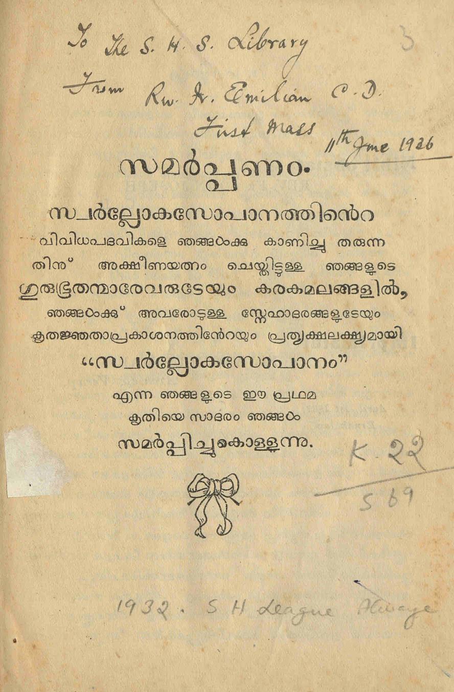 1932ൽ CMI സഭയുടെ പ്രയോർ ജനറൽ ആയിരുന്ന അച്ചൻ ലൈബ്രറിയിലേക്ക് കൊടുത്ത കോപ്പിയാണ് ഡിജിറ്റൈസ് ചെയ്തിരിക്കുന്നത് എന്ന് ഇതിലെ കൈയെഴുത്ത് സൂചിപ്പിക്കുന്നു.