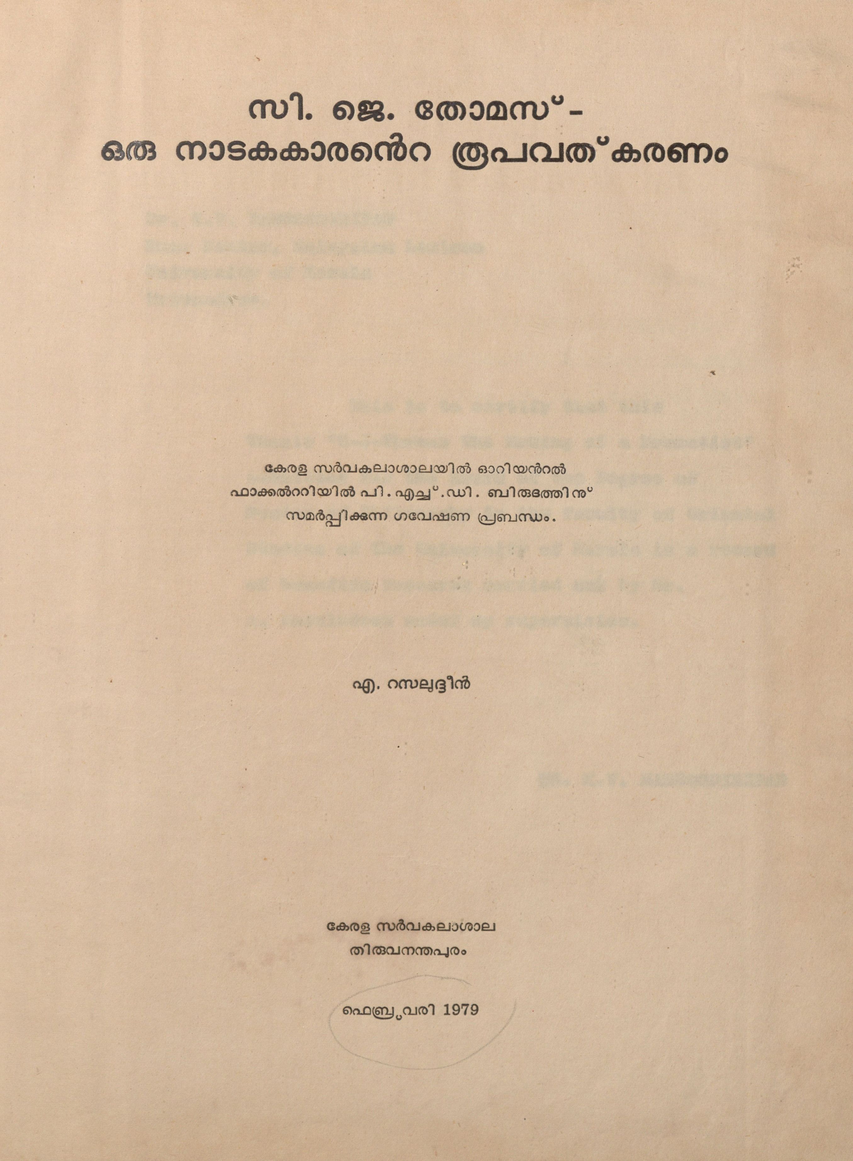 1979 – സി.ജെ. തോമസ് – ഒരു നാടകകാരൻ്റെ രൂപവത്കരണം – എ. റസലുദ്ദീൻ
