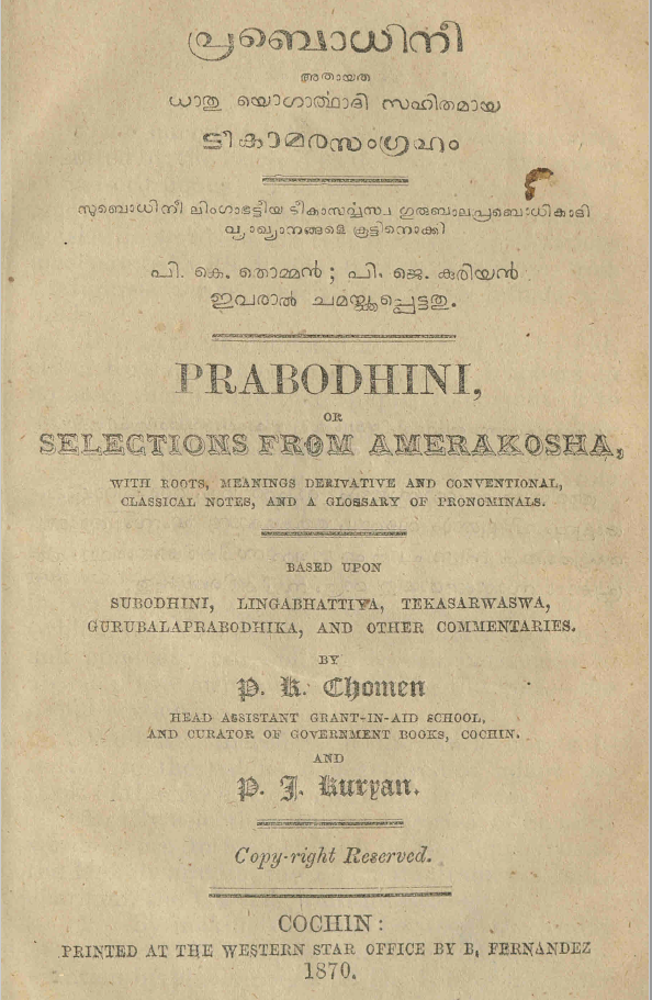 സംസ്കൃതപദകോശമായ അമരകോശത്തിൻ്റെ ഒരു വ്യാഖ്യാനമായ പ്രബൊധിനീ എന്ന പഴയ അച്ചടി പുസ്തകത്തിൻ്റെ ഡിജിറ്റൽ സ്കാൻ ആണ് ഈ പോസ്റ്റിലൂടെ പങ്കുവെക്കുന്നത്. പി.കെ. തൊമ്മൻ, പി.ജെ. കുരിയൻ എന്നിവർ ആണ് ഈ പുസ്തകം തയ്യാറാക്കിയിരിക്കുന്നത്.